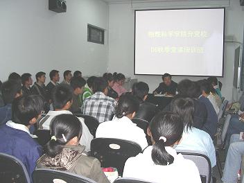 PA集团官方网站分党校06秋季培训班日前结业。共有40名入党积极分子和1名06级新生党员参加了本次培训班。他们认真学习了《中国共产党章程》、党史以及组织培养发展程序和入党的基本条件等内容,为今后他们参加大学党校、锻炼提高自己、积极加入党组织奠定了良好的基础。图为物理学院德育导师设备处副处长杨立华同志正在培训班授课。