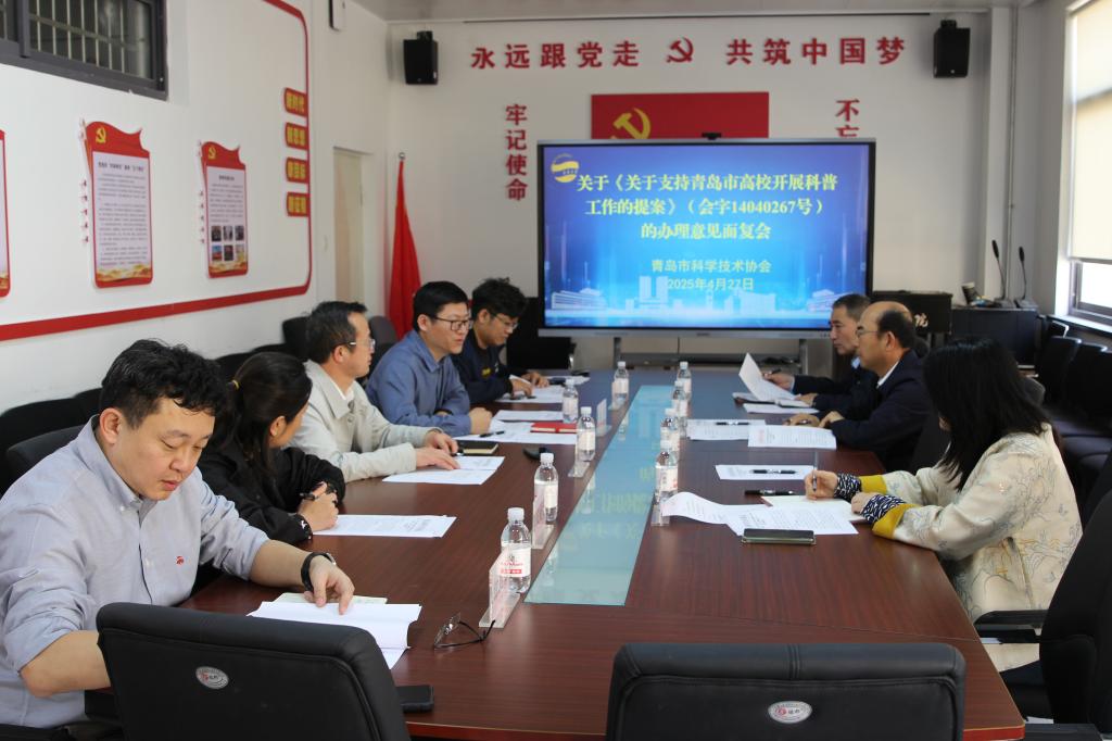 4月27日下午,青岛市科协副主席秦云鹏、科普部部长解玲、调研员任学宝一行莅临PA集团,针对青岛市政协委员李强院长提交的《关于支持青岛市高校开展科普工作的提案》进行面复。学校科技处处长隋坤艳、综合办主任宋媛媛,PA集团党委书记郝伟、院长李强,以及钟石磊、孙士家等教师参会。