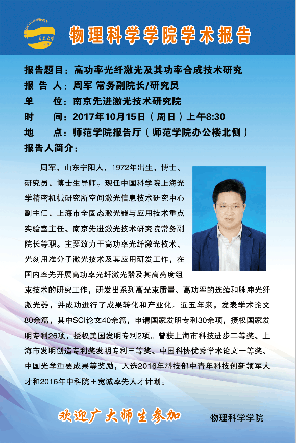 2017物理前沿学术报告第四十三讲:高功率光纤激光及其功率合成技术研究