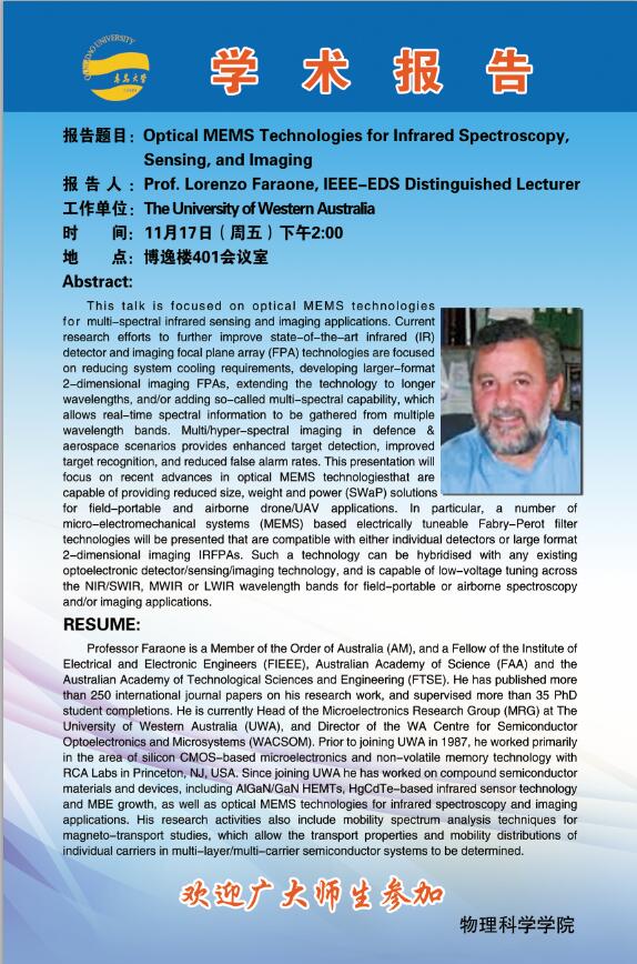 2017物理前沿学术报告第四十六讲:Optical MEMS Technologies for Infrared Spectroscopy, Sensing, and Imaging