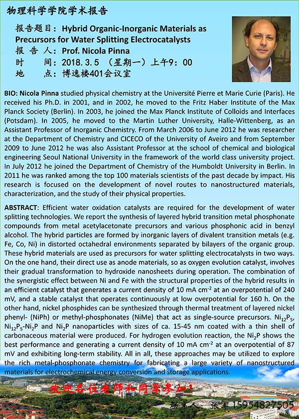 2018物理前沿学术报告第三讲:Hybrid Organic-Inorganic Materials as Precursors for Water Splitting Electrocalysts
