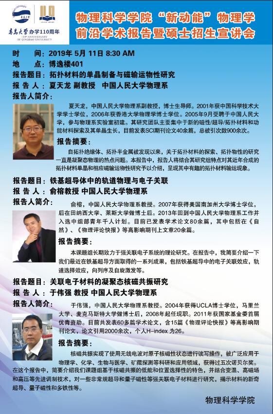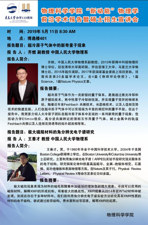 “新动能”物理学前沿学术报告暨考研宣讲4:超冷原子气体中的新奇量子现象等