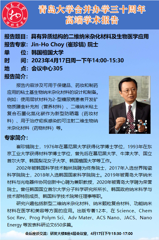 [学术活动]崔珍镐院士-具有异质结构的二维纳米杂化材料及生物医学应用