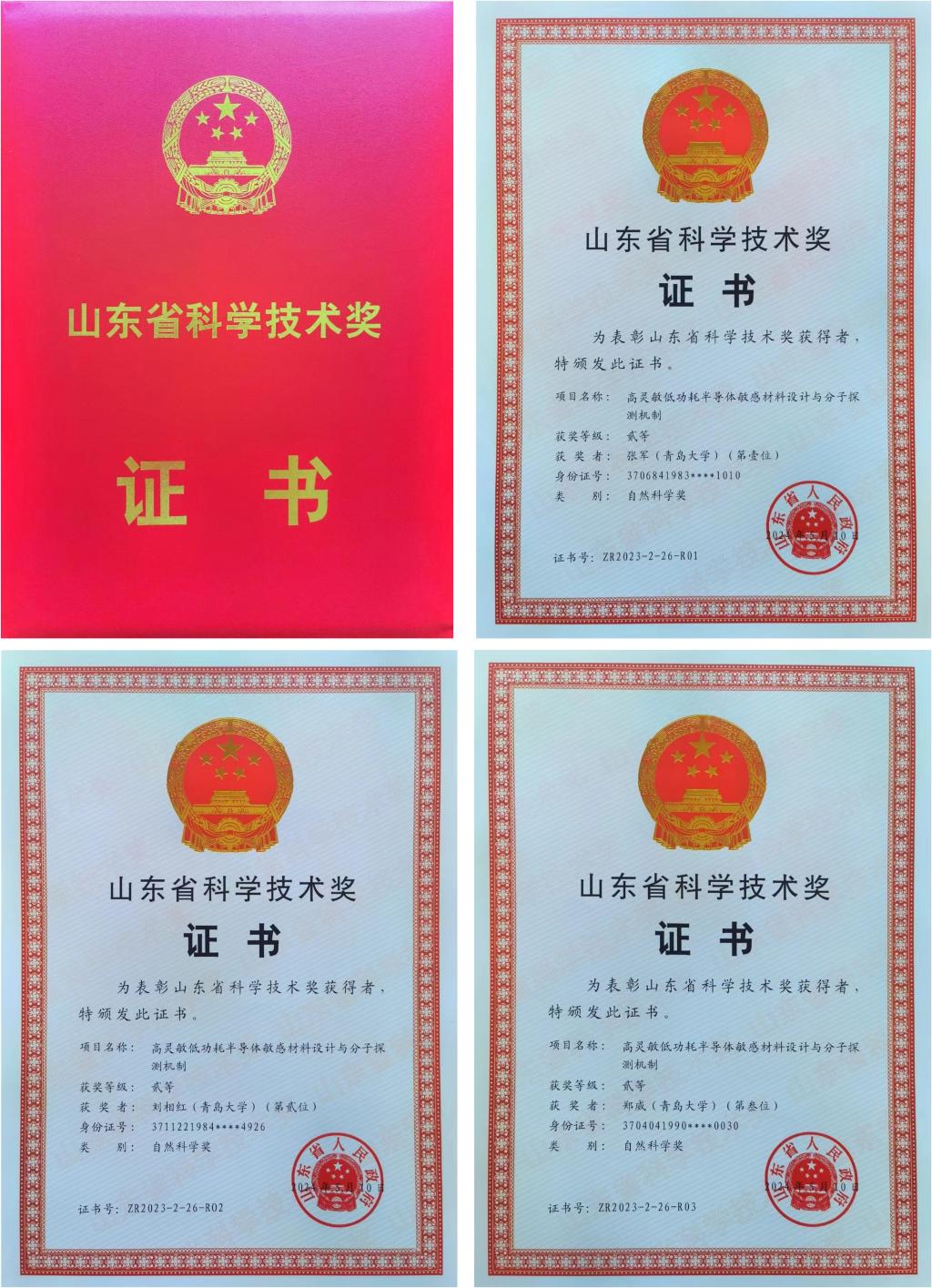 近日,山东省人民政府公布了《关于2023年度山东省科学技术奖励的决定》。经科学技术奖励评审委员会评审、省科学技术奖励委员会审定和省科技厅审核,由PA集团功能材料与器件团队张军教授、刘相红教授、郑威副教授等共同完成的研究成果“高灵敏低功耗半导体敏感材料设计与分子探测机制”荣获省自然科学二等奖。