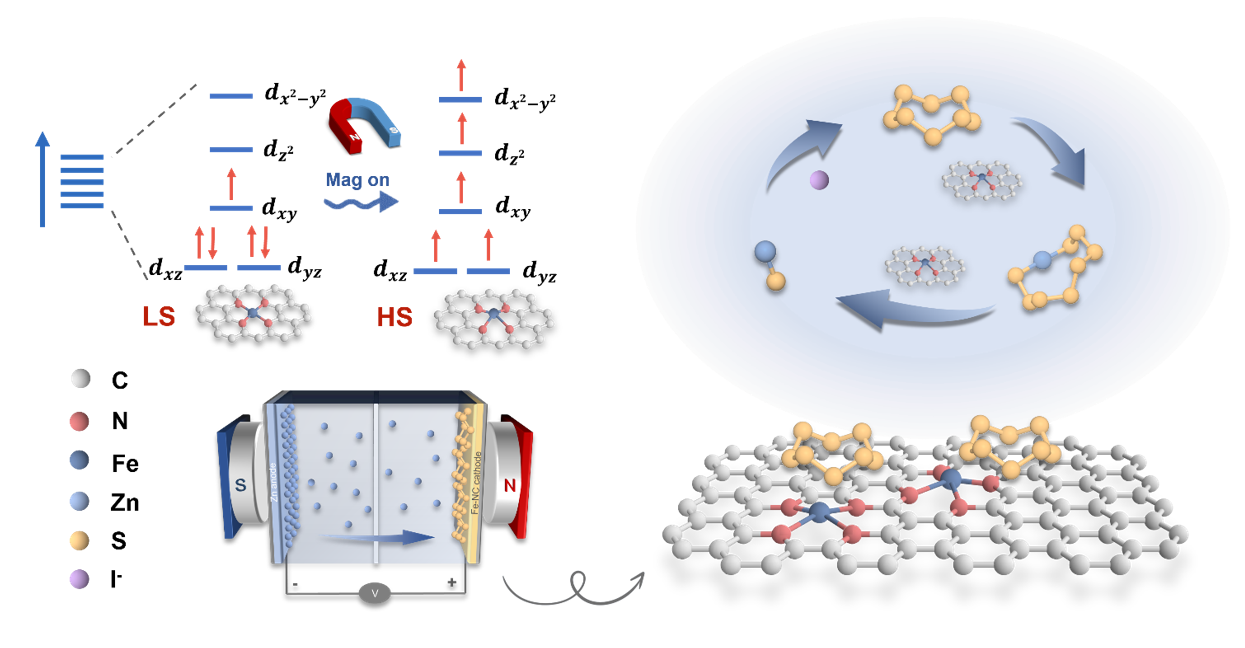 水系锌硫电池因其高能量密度、原材料丰富以及安全性,近年来被广泛视为下一代低成本储能器件的重要候选体系。研究团队围绕水系锌硫电池中磁场对于铁单原子催化剂自旋态的调节展开深入研究,提出了双催化(Fe/I-)和磁场调控相结合的双重策略。研究团队分别采用I-促进ZnS的氧化过程和用Fe-SAs促进S8的还原过程,优化了水系Zn-S电池的组装策略。通过磁场诱导铁活性位点的自旋态调控进一步提高了Fe-SAs的催化性能,通过调控催化剂的自旋态,实现了对硫还原反应路径的精准调控。研究表明,磁场作用下Fe-SAs的自旋态从低自旋向高自旋转变,有效提高了铁单原子催化剂的电子转移能力,进一步促进了硫正极的还原动力学,显著提升了锌硫电池的电化学性能,为新型高催化活性电催化剂提供了新的设计思路。