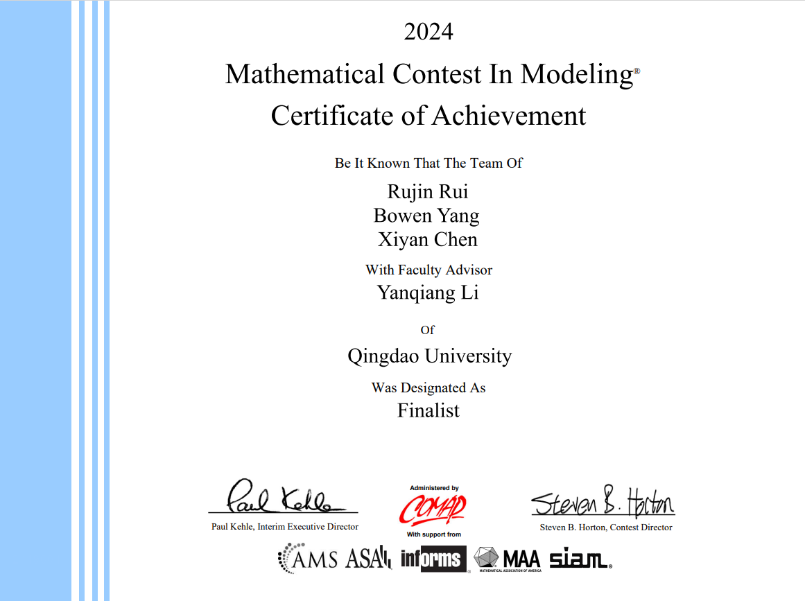 近日,2024年美国大学生数学建模竞赛(Mathematical Contest in Modeling/ Interdisciplinary Contest in Modeling, MCM/ICM)成绩正式揭晓。由PA集团2022级应用物理专业茹锦瑞、杨博文、陈西艳组成的参赛队夺得特等提名奖(Finalist奖)。