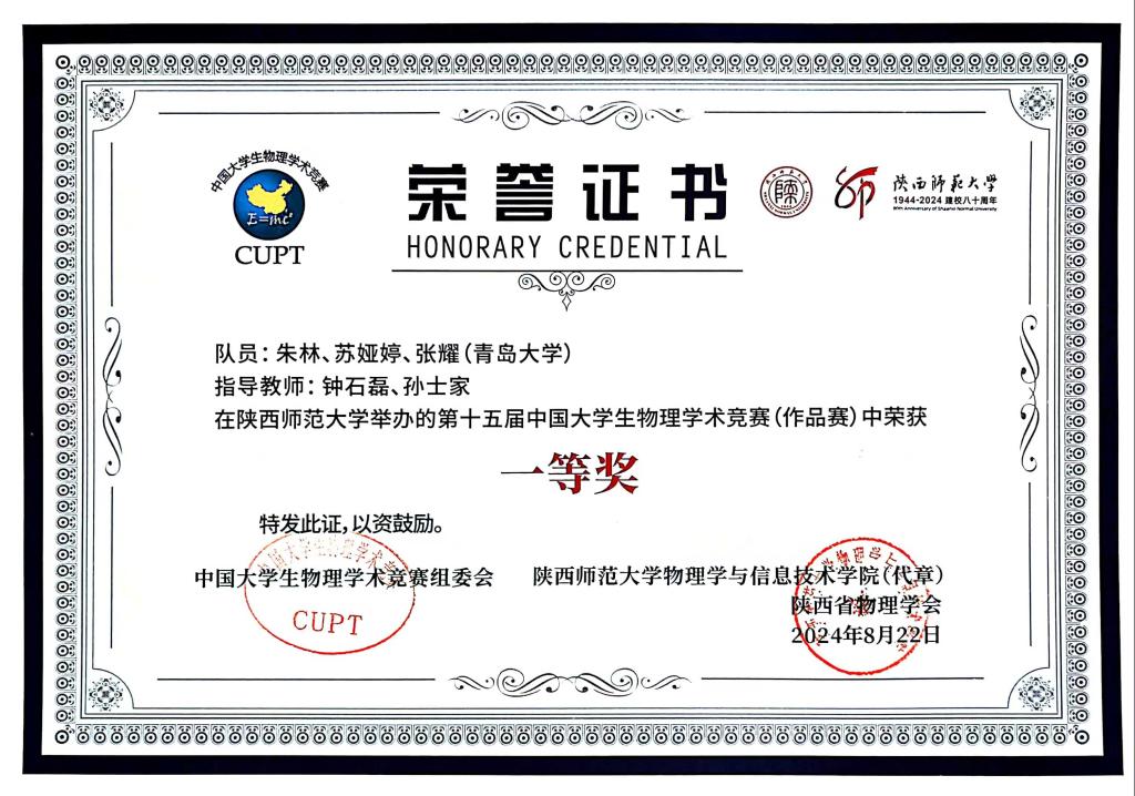 8月18—23日,第十五届中国大学生物理学术竞赛(CUPT)国赛在陕西师范大学胜利举办,来自哈尔滨工业大学、复旦大学、北京大学、山东大学等国内91所高校的92支队伍展开了激烈角逐。由PA集团三位本科生组成的PA集团官方网站代表队,最终在作品赛道荣获一等奖,创造历史最佳成绩,并实现该项赛事在2024年度山东省赛、华东区赛、全国赛的大满贯。