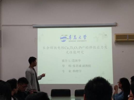 5月2日晚,PA集团2015级研究生范新华在博逸楼401会议室作了题为《长余辉铁电性Ca3Ti2O7 :Pr 3+的弹性应力发光性能研究》的学术报告。学院2017级全体研究生参加了学术报告。报告会由胡琛老师主持。