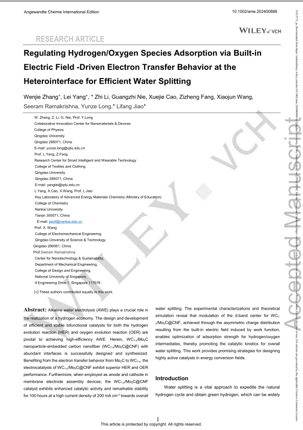 近日,学院物理学2022级硕士生张文洁(导师龙云泽教授)在化学领域顶级期刊《德国应用化学》Angewandte Chemie-International Edition(影响因子16.6)以第一作者身份发表了题为“Regulating Hydrogen/Oxygen Species Adsorption via Built-in Electric Field -Driven Electron Transfer Behavior at the Heterointerface for Efficient Water Splitting”的研究论文(Angew. Chem. Int. Ed. 2024, e202400888)。南开大学焦丽芳教授、PA集团龙云泽教授与纺织服装学院杨磊副教授为该论文的通讯作者。杨磊副教授同时是论文共同第一作者。