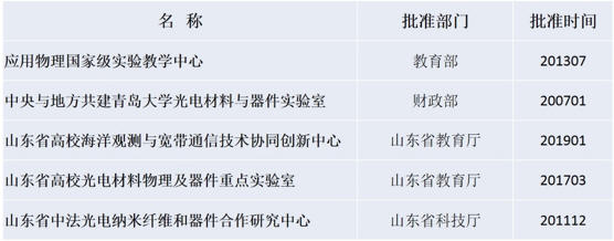 应用物理学是国家级特色专业、山东省特色名校工程重点建设专业;建有应用物理国家级实验教学示范中心、山东省“凝聚态物理”特色重点学科、山东省高校海洋观测与宽带通信技术协同创新中心、山东省“中法纳米光电技术国际合作中心”、山东省高校“光子学材料与技术”强化重点实验室、中央与地方共建高校特色优势学科“光电材料与器件实验室”、山东省研究生联合培养基地4个。建有山东省高校人才培养模式创新实验区1个,校企共建教学实习基地9个,形成了完备的人才培养学科平台。