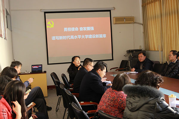 黄国俊简要介绍了校第三次党代会的有关情况和校党委书记胡金焱在会上所作的题为《勇担使命 奋发图强 谱写新时代高水平大学建设新篇章》的亮点内容,并对今后一段时间校党代会精神的学习作了部署。滕冰结合报告内容和学院工作,从学科建设、教育教学、人才建设、科学研究、新旧动能转换等方面谈了自己的学习体会。周志强副书记结合学生工作、工会和校友工作谈了学习体会。