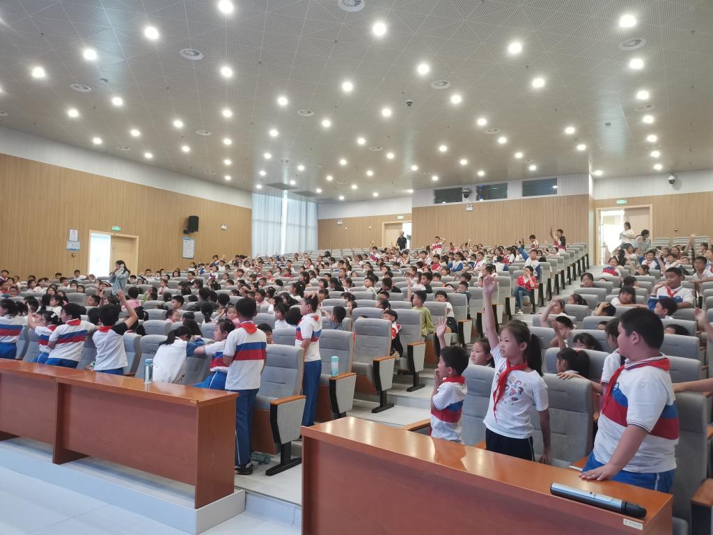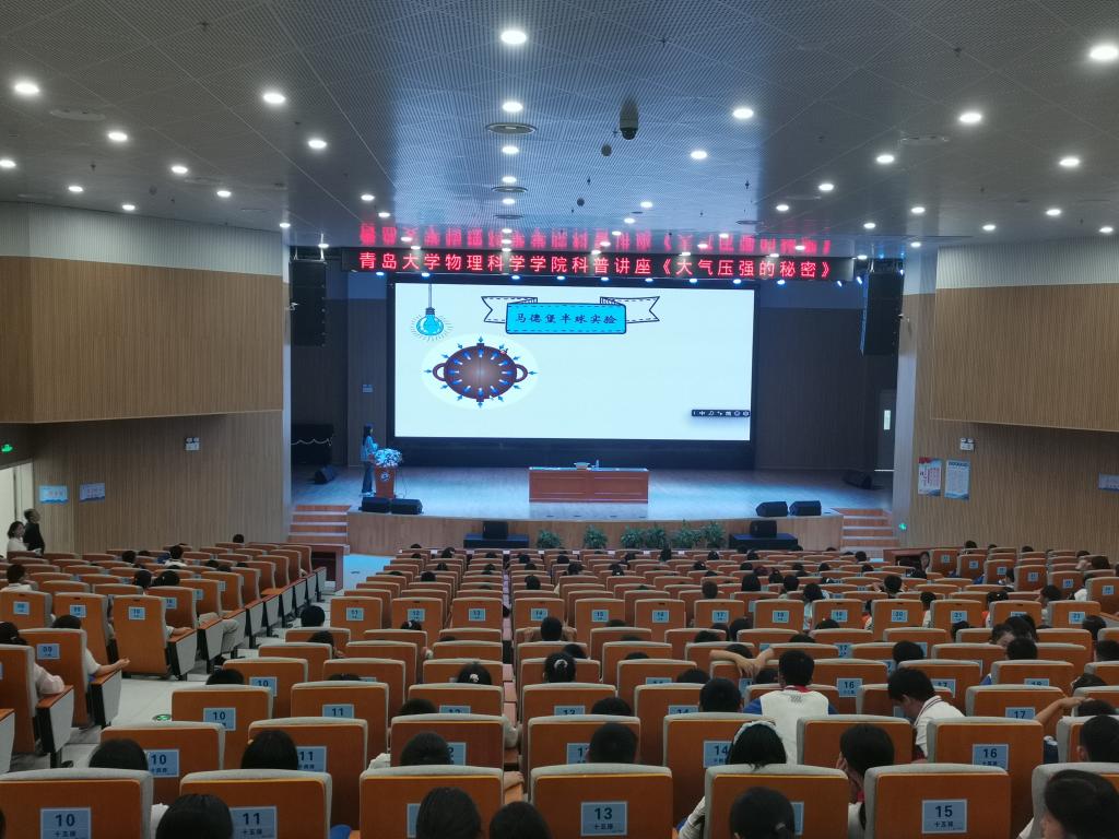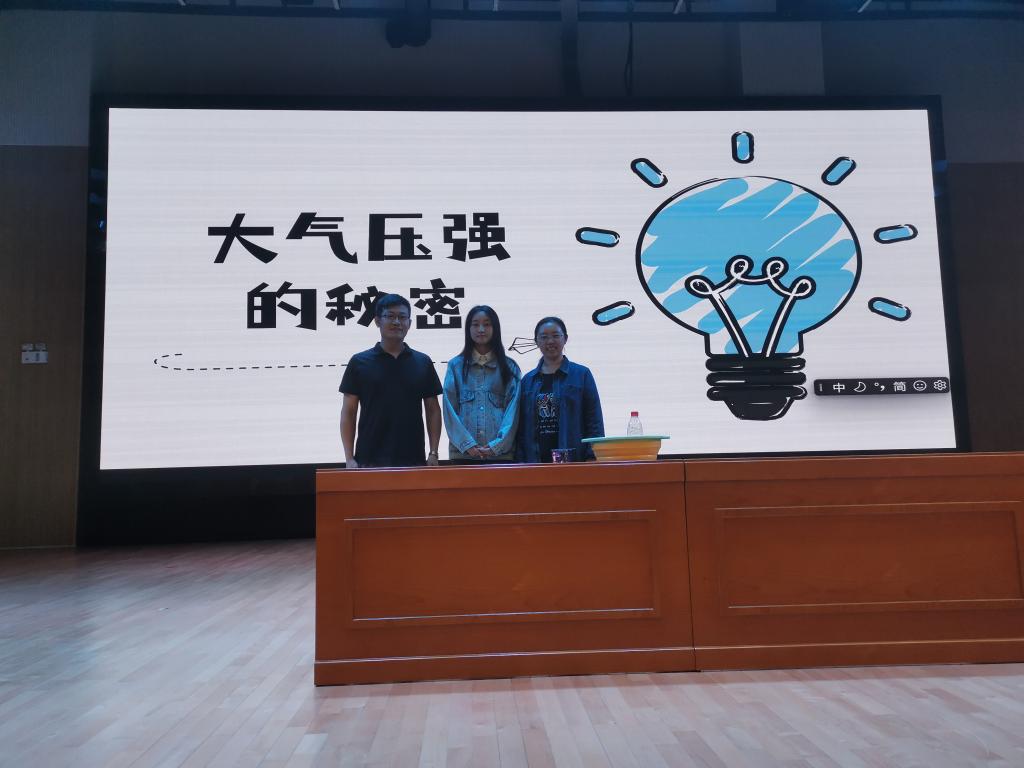 讲座围绕什么是大气压强、大气压强的方向、大小等性质以及大气压强的应用为主线,通过科学、严谨、趣味的漫画视频和现场动手实验,为近600位师生带来了一堂生动有趣、印象深刻的自然科学课。整个报告现场气氛热烈,同学们热情高涨,时而面露疑问,时而发出惊叹,每一张可爱的脸上都流露出对物理的好奇和科学的敬仰。