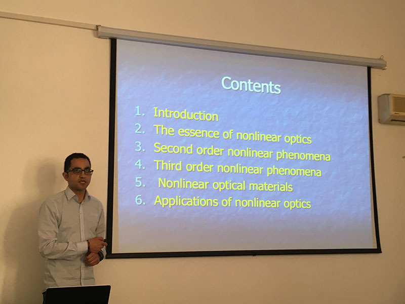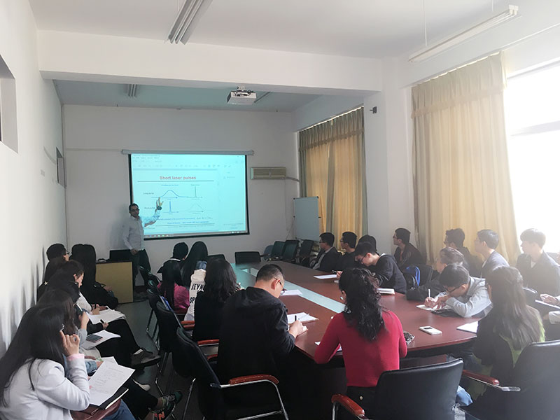 会上,Dr. Shalaby Mostafa首先就光的强度、相干性,通过与线性光学的对比,简单介绍了非线性光学;揭示了非线性光学的本质,并通过和频、差频阐述了二阶、三阶非线性光学效应;简单介绍了如何产生脉冲激光及其应用。报告结束后,他就同学们提出的为了得到较强的激光、如何将各个脉冲压缩,除了DAST晶体,是否还有其他的THz获得方式,及激光是否为产生THz的唯一手段等问题做了详细解答。