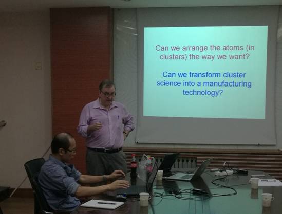 Richard E. Palmer教授在报告中详细介绍了金属团簇尺寸控制的方法、原子构型的探测、金属团簇结构演化规律等方面的研究。报告会后,Palmer教授与PA集团官方网站的青年教师和研究生进行了深入交流和讨论,为同学们解答疑惑,并与同学们就出国留学问题进行了座谈。