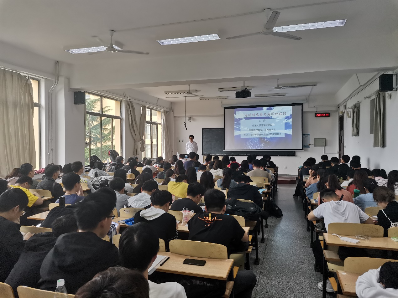 在报告中,吴锜通过一个妙趣横生的动画视频向同学们展示了海洋传感器的工作原理,并简要介绍了自己的学术背景和科研经历。吴锜强调海洋科学是一门观测科学,并从海洋传感器的分类、应用、搭载的平台以及未来发展趋势和面临的挑战进行了详细分析。吴锜指出,大范围、高密度、长期连续、立体观测是未来海洋观测的发展方向,观测方式也由定点阵列观测向固定与移动平台相结合的海洋物联网方向发展,而海洋传感器作为信息获取的重要手段,是海洋物联网的核心技术,其未来发展方向是朝着微型化、低成本、低功耗、高一致性,支撑小型化和微型化的海洋小浮子,实现大范围高密度组网。提问环节同学们积极踊跃发言,吴锜耐心为大家一一解答。