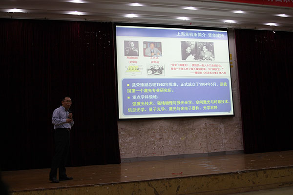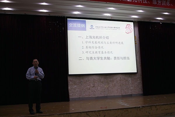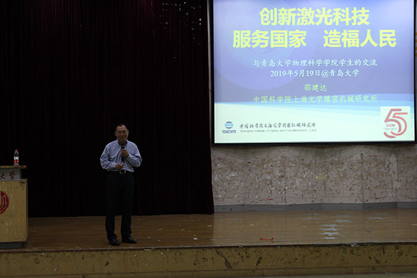 在报告中,邵建达首先介绍了中国科学院上海光学精密机械研究所在超强超短激光、激光惯性约束聚变、空间冷原子钟、空间激光通信及高功率激光相关材料与器件等研究领域的最新进展,然后介绍了中国科学院上海光机所研究生招生与培养情况,最后从中国科学院上海光机所的历史使命出发与青大学生探讨了中国当代青年的责任与担当。报告结束后,参会的本科生、研究生针对报告内容、研究生报考等问题积极提问,邵建达作了详细解答。