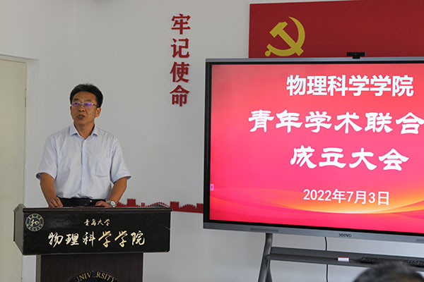 7月3日上午,PA集团官方网站青年学术联合会成立大会暨学术报告会在博逸楼401举行。校党委常委、副校长于永明,山东大学晶体所常务副所长、国家杰青于浩海,科技处处长李荣贵出席大会。学院党委书记郝伟、院长滕冰及联合会成员、师生代表共50余人参加会议,会议由滕冰主持。