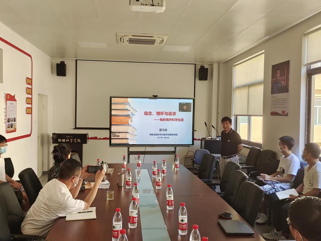 9月7日上午,武汉中科院精密测量科学与技术创新研究院管习文研究员受邀来PA集团访问,并以线上线下结合的方式为学院师生作了题为《信念、情怀与追求--我的偶然科学生涯》和《Observation of Spin-Charge separation in 1D atomic Fermi gases》的报告。报告由院长滕冰教授主持。院党委书记郝伟及李强教授、张永成副教授等老师和部分本科生和研究生聆听了报告。