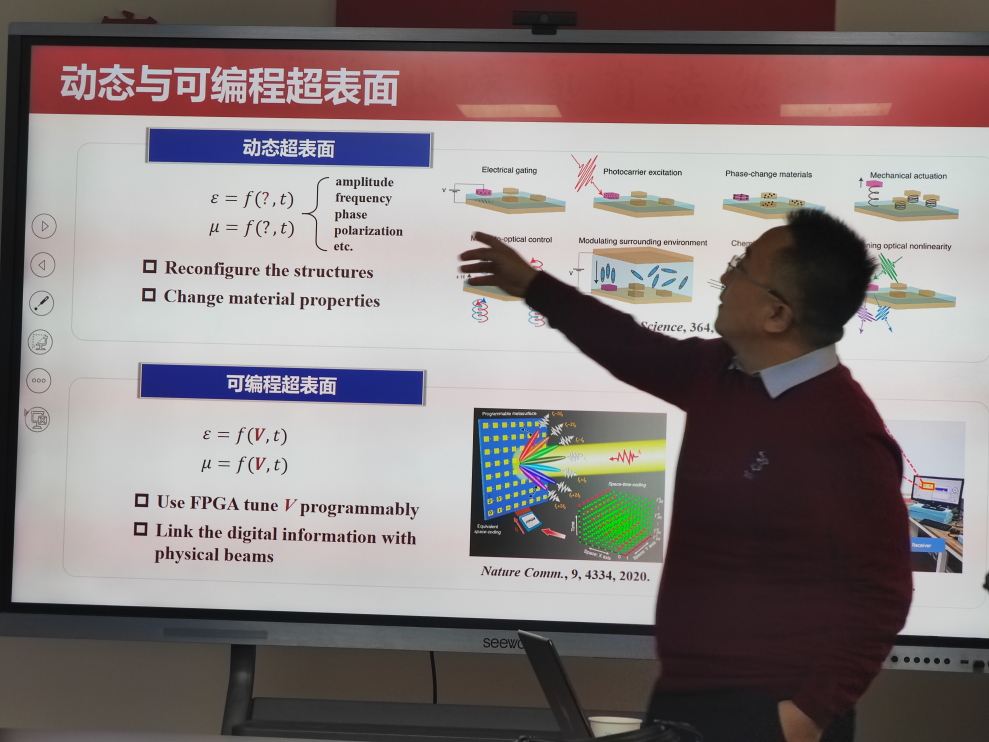 在报告中,张翼飞介绍了太赫兹集成电路的发展趋势和应用前景,讨论了山东大学集成电路学院太赫兹团队在无源电路器件、有源异质集成电源和空间波调控技术等方面的研究进展,展示相关技术在先进无线电系统中的应用。参会老师和同学与张教授就太赫兹系统应用于脑胶质瘤等医学诊断和无源成像等关键技术问题进行了深入探讨和交流。