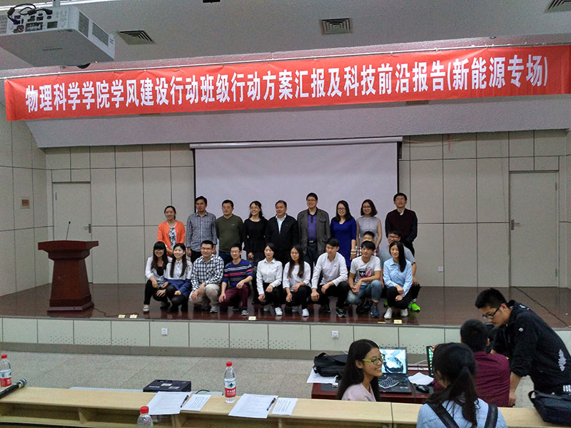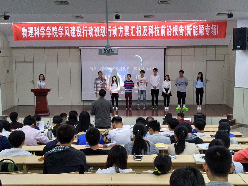 5月20日,在图书馆报告厅,PA集团官方网站学风建设行动迎来了第二场班级行动方案汇报及科技前沿报告——新能源科学与工程专场,整场报告从现场布置、主持、报告等全部工作由该专业2013、2014和2015级三个年级合作完成,本专业全体同学参加。活动邀请各班级班主任担任评委,系主任担任点评嘉宾。此次活动学院党委书记黄国俊、副院长滕冰及部分任课教师和辅导员到场参加。