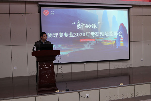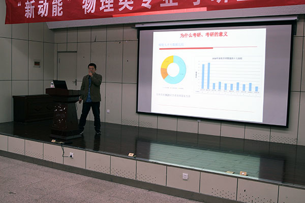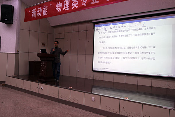 4月18日晚,PA集团在图书馆报告厅举行“新动能”物理类专业2020年考研宣讲报告会。数学与统计学院教授纪培胜老师、公共外语教育学院考研英语资深辅导专家孙培星老师受邀为2016级本科生作了考研辅导专题报告。学院院长滕冰、党委副书记郝伟、副院长龙云泽、院长助理邵渭泉及相关人员参加宣讲会。宣讲会由龙云泽主持。