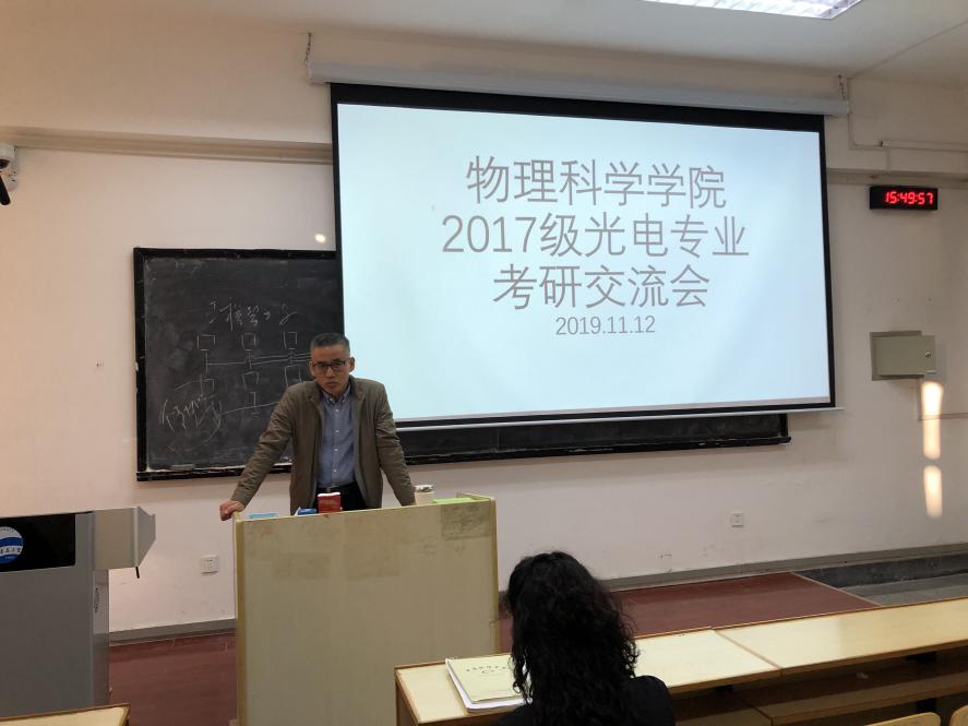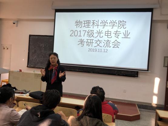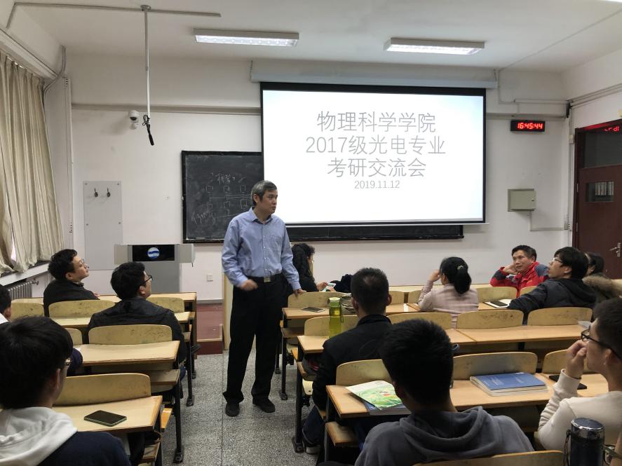 11月12日,PA集团2017级光电专业考研交流会在博学楼302教室举行。出席本次交流会的有:院长滕冰教授、党委副书记郝伟老师、光电信息科学与工程系主任云茂金教授、陈戍老师、刘兵老师、徐洪浩老师、马军艳老师、钟石磊老师等,以及2017级光电专业一、二班全体同学。本次交流会由滕冰主持。