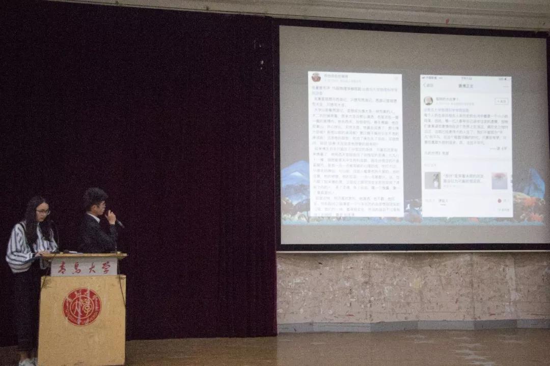 四班桑鸿运同学讲述了他与读书的爱恨情仇。各班的优秀代表上台为我们展示了各个班级举行的精彩活动。