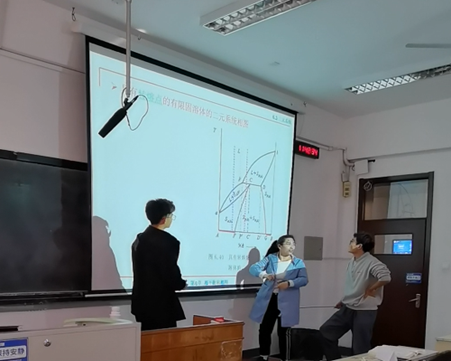 授课过程中,我也会鼓励倡导同学们大胆发言,不仅关注教学内容的传递,还注重学生的接受效果。有一次,在学习相图时,我让同学到台上展示自己的理解,开始有一位同学自告奋勇,后来竟然上来三位同学,发表不同的看法,而且争得面红耳赤,场面非常热闹,台下的同学也蠢蠢欲动……。热烈的教学氛围提高了学生的学习热情。除此之外,我及时进行考勤,按时布置课后作业并进行认真修改与讲解,在点名册上认真记录平时成绩,做好每一步教学工作。