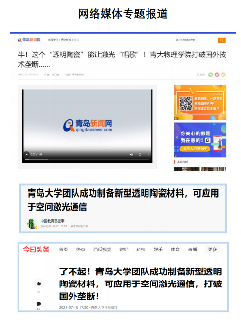 甘做冷板凳、勇啃硬骨头、十年磨一剑、攻克重大技术难题。透明电光材料是光通信器件的核心,也是制约我国光通信技术发展的卡脖子问题之一。美国已率先实现了高性能透明电光陶瓷的制备及器件研发,而国内一直未能突破。面对课题组前期研究基础薄弱、核心设备缺乏,测试设备不完善等困难,本人迎难而上,历时16年,先后自主研发透明陶瓷烧结热压炉,攻克粉体制备、坯体成型和陶瓷烧结等核心关键技术,成功制备出接近理论极限透光率的高性能透明电光陶瓷,并实现了自由空间光通信和血管壁的高频超声成像。被青岛电视台、搜狐、今日头条等多家媒体报道,并于华为等公司合作开展器件研发工作,相关成果获山东省自然科学二等奖。获批国家自然科学基金面上项目、广西重点研发计划子课题、山东省自然学科基金等10余项,发表高水平SCI论文50余篇,授权发明专利4项,逐渐形成了自己的特色,获得国内同行的认可,多次受邀参加学术会议并作邀请报告。基于该成果指导学生竞赛获奖全国大学生光电设计大赛二等奖2项、山东省互联网+、挑战杯省赛金奖2项,科技创新大赛、中国(青岛)国际精英创业创新大赛等奖项20余项。获评山东省创新创业大赛优秀指导教师、PA集团官方网站科技创新大赛金牌指导教师,连续两年获评PA集团官方网站优秀研究生指导教师称号。